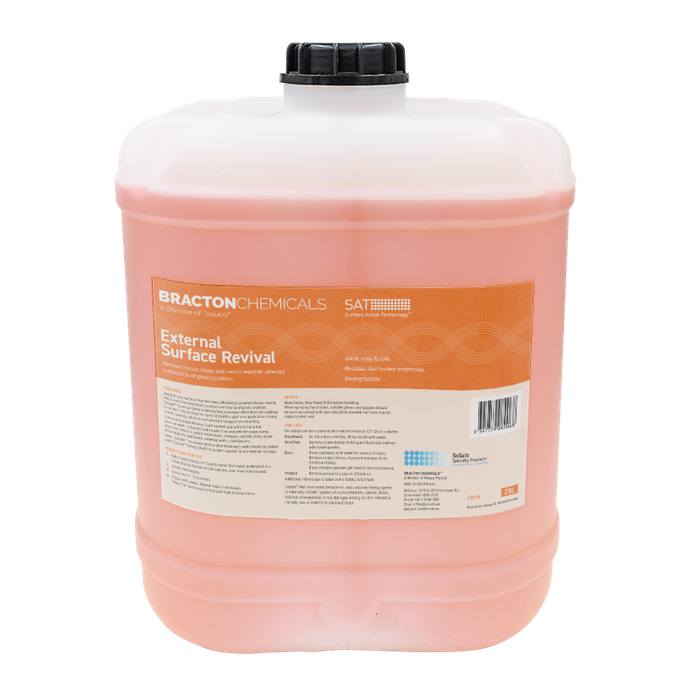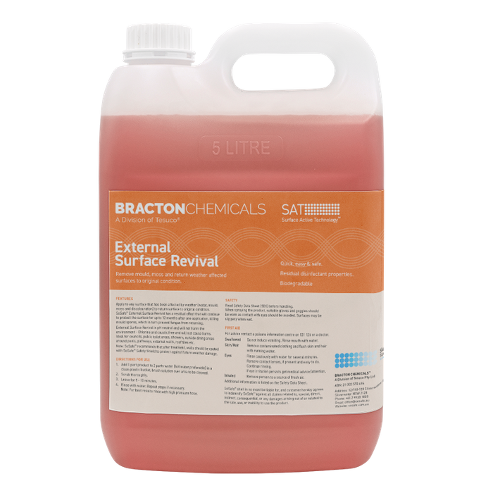 Apply to any surface that has been affected by weather ( water, mould, moss and discolouration ) to return surface to original condition. SoSafe External Surface Revival has a residual effect that will continue to protect the surface for up to 12 months after one application, killing mould spores, which in turn prevents fungus from returning. External Surface Revival is pH neutral and will not harm the environment, caustic and chlorine free and will not cause burns. Ideal for councils, public toilet areas, showers, outside dining areas, around pools, pathways externals walls, roof tiles etc. Note: SoSafe recommends that after treatment, walls should be coated with SoSafe Safety Shield to protect against future weather damage.
