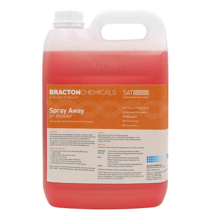 A powerful cleaner and degreaser. Spray away is a non-corrosive formulation that will clean almost any surface free of general build-up, dirt, mould, oil and grease on hard surfaces and engine parts. This product is for use in the chassis was and work shop areas only. Suitable for the cleaning of heavily soiled areas and removal of heavy build-up of grease and oil on hard surfaces and engine parts.